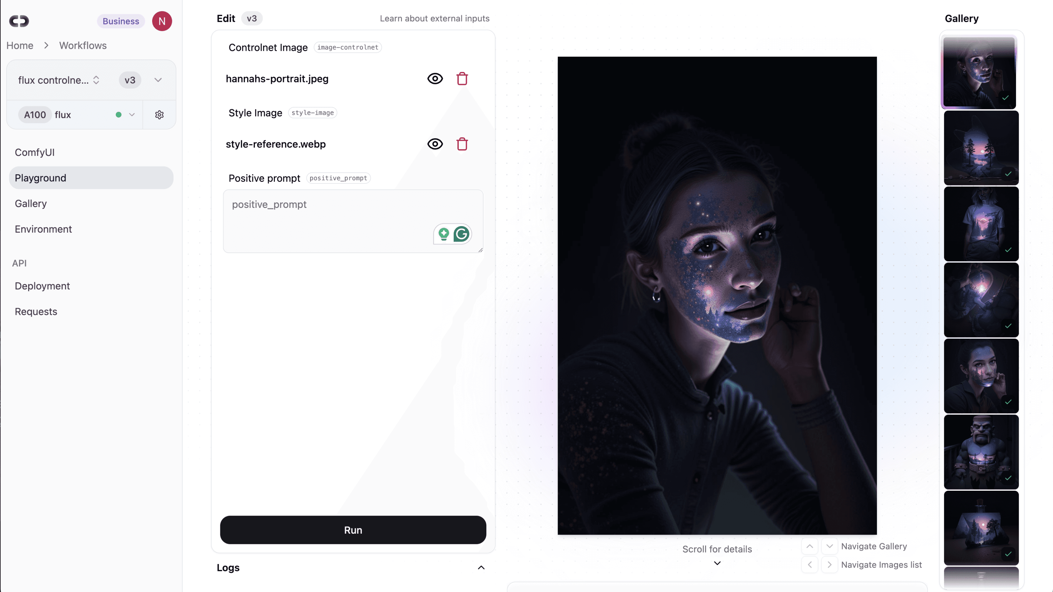 Share your ComfyUI workflows with links. Use ComfyUI instantly in the cloud or share a simplified UI. Deploy production APIs in one click and scale effortlessly, no engineering required.
