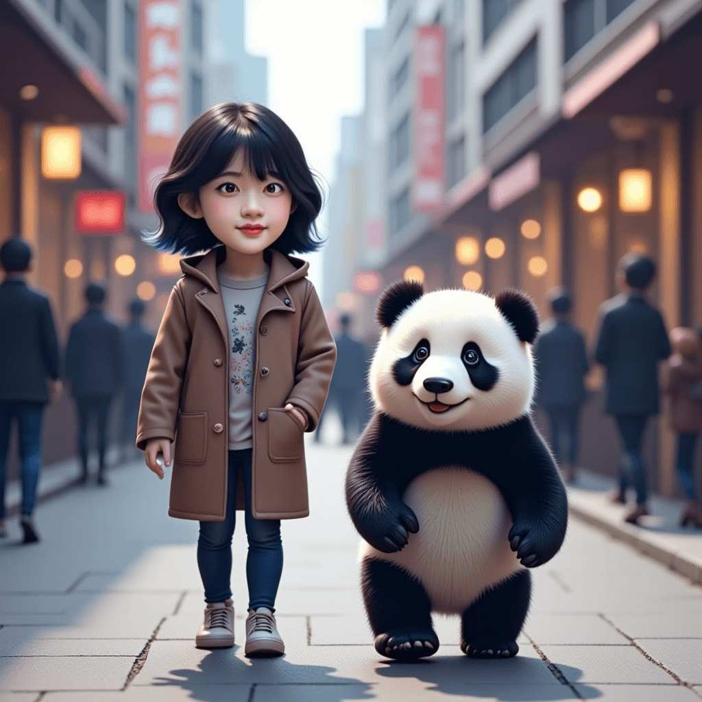 Result: Both the girl and the panda appear in the scene, each with their identity preserved.