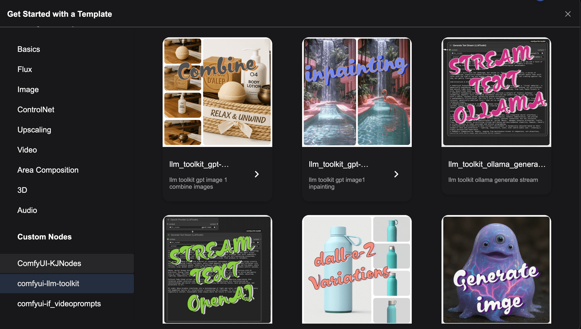 The LLM toolkit will handle a variety of APIs and local LLM inference tools to generate text, images, and Video (coming soon). Currently, you can use Ollama for Local LLMs and the OpenAI API for cloud inference, including image generation with gpt-image-1 and the DALL-E series.
