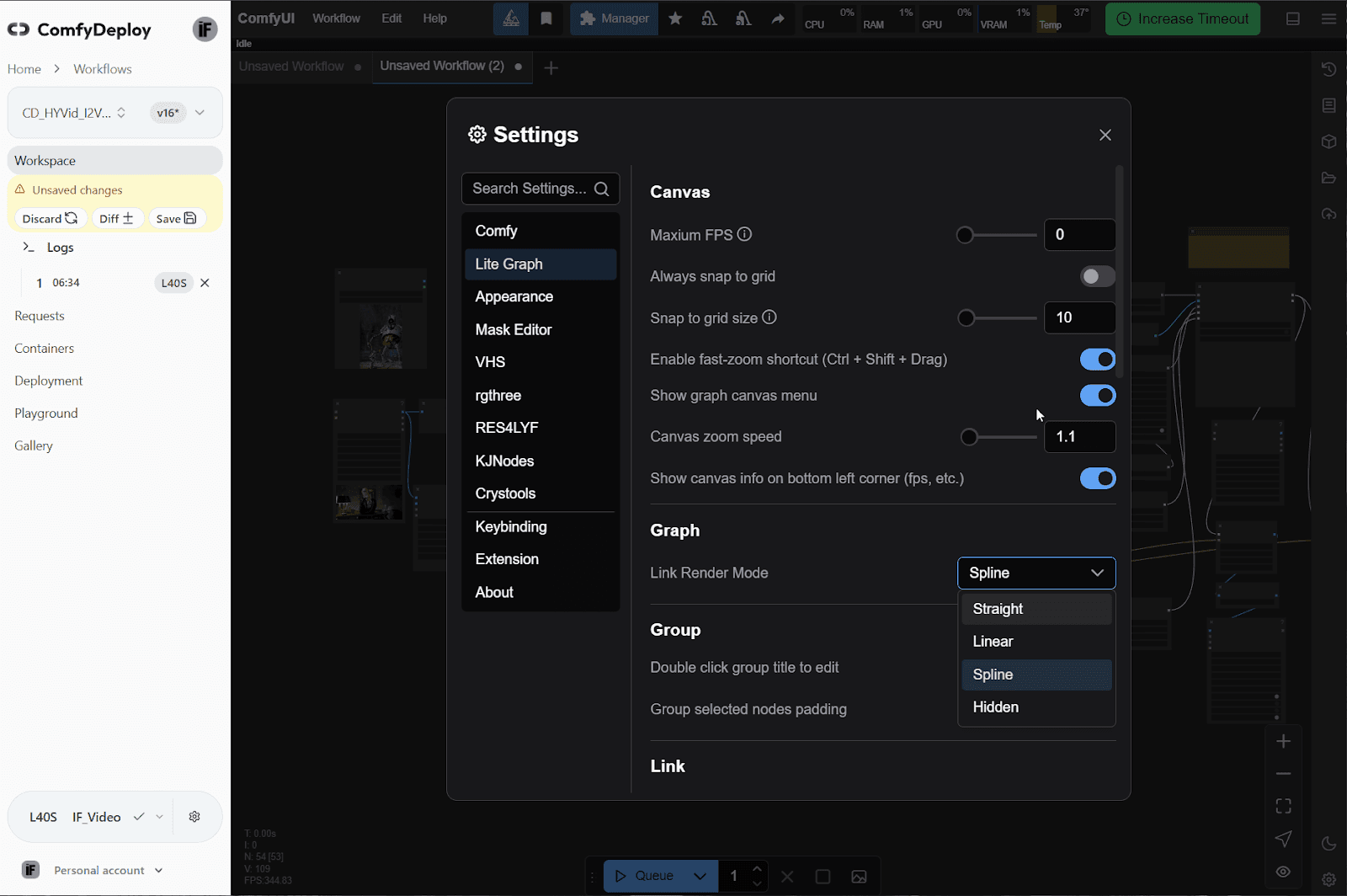 Okay I like the straight nodes so I am going to click the cogwheel at the button right corner and in litegraph select straight for the node connections