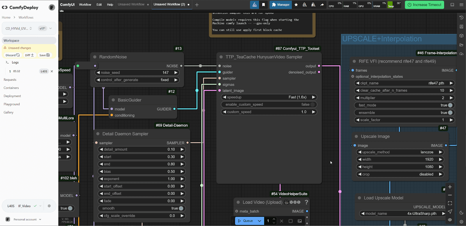 Finally we have the sampler that applies a tea cache to speed up things a little you can disable the tea cache by setting the speed to 1x then we get an upscale and interpolation pass you can bypass this if you want to tweak your settings