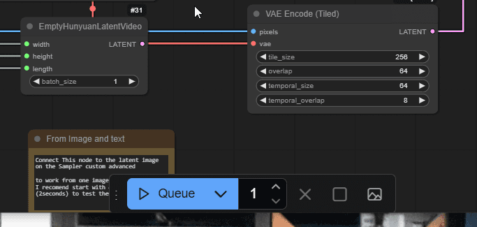 VAE Encode Tiled this node will pass to the latent from the video to the sampler this will create a video that resembles a bit more the original to guide the generation it will still use the prompt but the result will be still a little random.